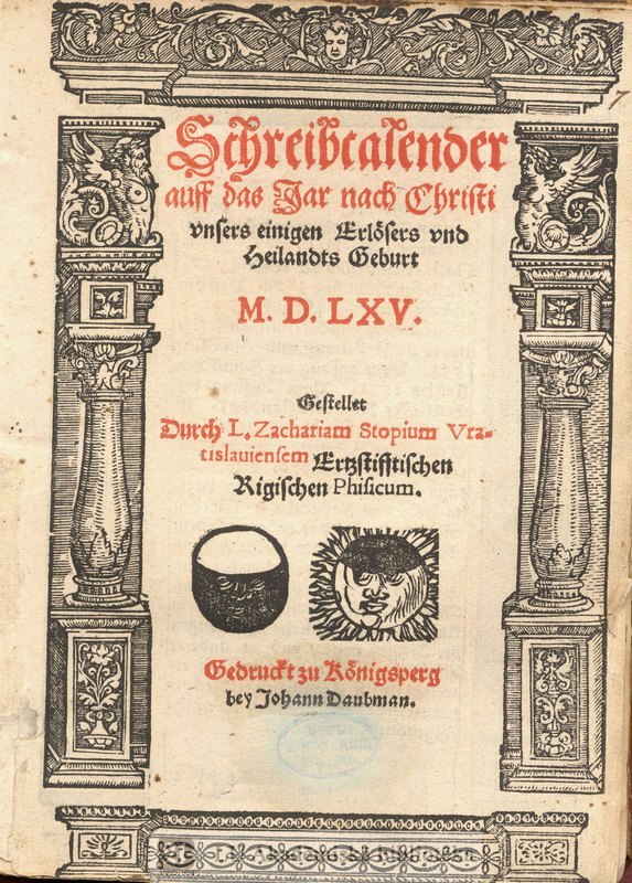 In Zacharias Stopius, Schreibcalender auff das Jar nach Christi vnsers einigen Erlösers vnd Heilands Geburt M.D.LXV, Königsberg: Hans Daubmann (printer), 1564 (Riga, LU Akadēmiskā bibliotēka), fol. A1