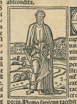| [T74573] | Bearded Man Standing on the Road to the City. In Biblia cum concordantiis veteris et novi testamenti, Jerome of Stridon (translator), Lyon: Jacques Sacon (printer), Anton (II) Koberger (publisher), 10 May 1518 (Munich, BSB), fol. CLXVIII ◼ | printing: impression | page: figure | woodcut | paper | book decoration: illustration |  | | | | | | |