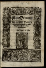 | [T76064] | Title-page Border with Candelabrum Ornament, Hunt Scenes and Assunta. In Martin Luther, Ain Sermon Am tag vnser Frawen Liechtmeß, Augsburg: Melchior Ramminger (printer), 1523 (Munich, BSB), fol. A1r ◼ | printing: impression | page: marginalia and borders | woodcut | paper | book decoration: front matter | ![]() | ||||||