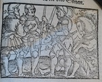 | [T89734] | Hans Brosamer (printmaker), Florens with the head of the Giant King. In Ein schöne vnd kurtzweilige History vonn Keiser Octauiano, Wilhelm Salzmann (translator), Frankfurt am Main: Heirs of Weigand Han (printer attr.), 1564 (Stockholm, KB), fol. 66v ◼ | printing: impression | page: figure | woodcut | paper | book decoration: illustration |  | | | | | | |