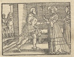 | [T89717] | Hans Brosamer (printmaker), The Emperor’s mother slanders his wife to him. In Ein schöne vnd kurtzweilige History vonn Keiser Octauiano, Wilhelm Salzmann (translator), Frankfurt am Main: Heirs of Weigand Han (printer attr.), 1564 (Stockholm, KB), fol. 6r ◼ | printing: impression | page: figure | woodcut | paper | book decoration: illustration |  | | | | | | |
