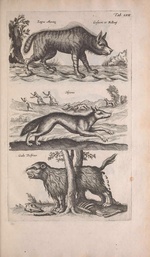 | [T89977] | Tab. LVII Sea wolf, Hyena and Wolverine (Lupus Marinus, Hijaena, Gulo). In Jan Jonston, Historiae Naturalis De Quadrupedibus Libri. Cum aeneis figuris ..., Amsterdam: Jan Janszoon Schipper (printer), 1657 (Washington, DC, Smithsonian Libraries) ◼ | printing: impression | page: figure | engraving | paper | book decoration: illustration | ![]() |