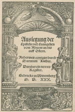 | [T7677] | Georg Lemberger (printmaker attr.), Title-page border with putti. In Martin Luther, Auslegung der Episteln vnd Euangelien vom Aduent an bis auff Ostern ..., Wittenberg: Hans Lufft (printer), 1530 (Halle (Saale), ULB), fol. A1r ◼ | printing: impression | page: marginalia and borders | woodcut | paper | book decoration: front matter |  | | | | | | |