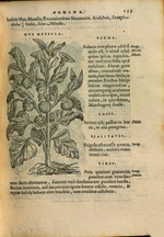 | [T77250] | Indian Thornapple (Nux metella). In Pietro Andrea Mattioli, Petri Andreae Matthioli Compendium de plantis omnibus, una cum earum iconibus, de quibus scripsit suis in commentariis in Dioscoridem editis, Venice: Vincenzo Valgrisi (printer), 1571 (Augsburg, SSB), p. 153 ◼ | printing: impression | page: figure | woodcut | paper | book decoration: illustration |  | | | | | | |