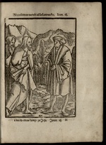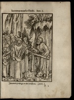 | [T39585] | St John the Baptist Disputing with the Pharisees and Sadducees (Ioannes praecursor Christi). In Doctrina, vita, et passio, Jesu Christi, iuxta Novi Testamenti fidem et ordinem, artificiosissime effigiata, Frankfurt am Main: Christian Egenolff (printer), 1550 (Munich, BSB), fol. F2r ◼ | printing: impression | page: figure | woodcut | paper | book decoration: illustration |  | | | | | | |