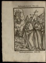| [T39598] | Risen Christ with Two Apostles and the Bust of God the Father in the Sky (Christus vadit ad patrem). In Doctrina, vita, et passio, Jesu Christi, iuxta Novi Testamenti fidem et ordinem, artificiosissime effigiata, Frankfurt am Main: Christian Egenolff (printer), 1550 (Munich, BSB), fol. G4v ◼ | printing: impression | page: figure | woodcut | paper | book decoration: illustration |  | | | | | | |