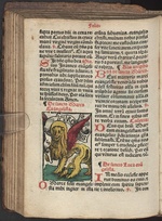 | [T78548] | Symbol of St Mark. In Hortulus anime, Strasbourg: Johann (I) Knobloch (printer), 1516 (Munich, BSB), fol. 46v ◼ | printing: impression | page: figure | hand colouring, woodcut | paper | book decoration: illustration |  | | | | | | |