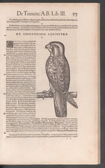 | [T88836] | Common Kestrel (De Tinnunculo accipitre). In Conrad Gessner, Conradi Gesneri ... Historiae animalium liber III., qui est de avium natura, Zürich: Christoph Froschauer (printer), 1555 (Zürich, ZB), p. 53 ◼ | printing: impression | page: figure | woodcut | paper | book decoration: illustration |  | | | | | | |