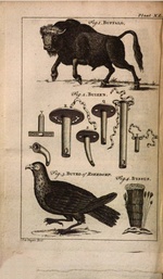 | [T86935] | Buzzards, Musk Buffalo and Little Indian Buffalo. In William Frederick Martyn, A new dictionary of natural history, vol. 2, London: 1785 (Washington, DC, Smithsonian Libraries), Pl. XX ◼ | printing: impression | page: figure | paper | book decoration: illustration | ![]() |