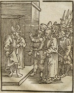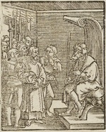 | [T80302] | Erhard Schön (printmaker), Christ before Annas. In Johannes Hoffmeister, Postylla cžeska Totiž Kázanij na Euangeliá, Prostějov: Johann Günther (printer), 2 May 1551 (Prague, NK ČR), fol. CXXXVIIIv ◼ | printing: impression | page: figure | woodcut | paper | book decoration: illustration |  | | | | | | |