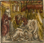 | [T61296] | Sick-bed (as Healing the Royal Official's Son). In Martin Luther, [Haußpostill über die Sonntags- und Fest-Evangelia], Veit Dietrich (compiler), Augsburg: Heinrich Steiner (printer), 1545, fol. CXLVIIr ◼ | printing: impression | page: figure | woodcut, hand colouring | paper | book decoration: illustration |  | | | | | | |